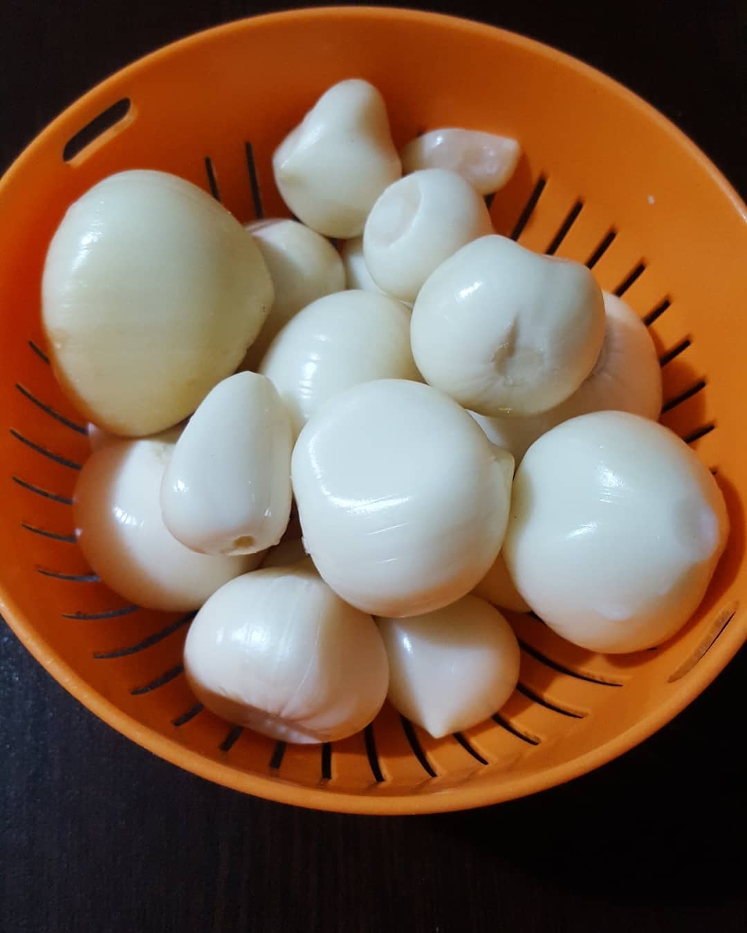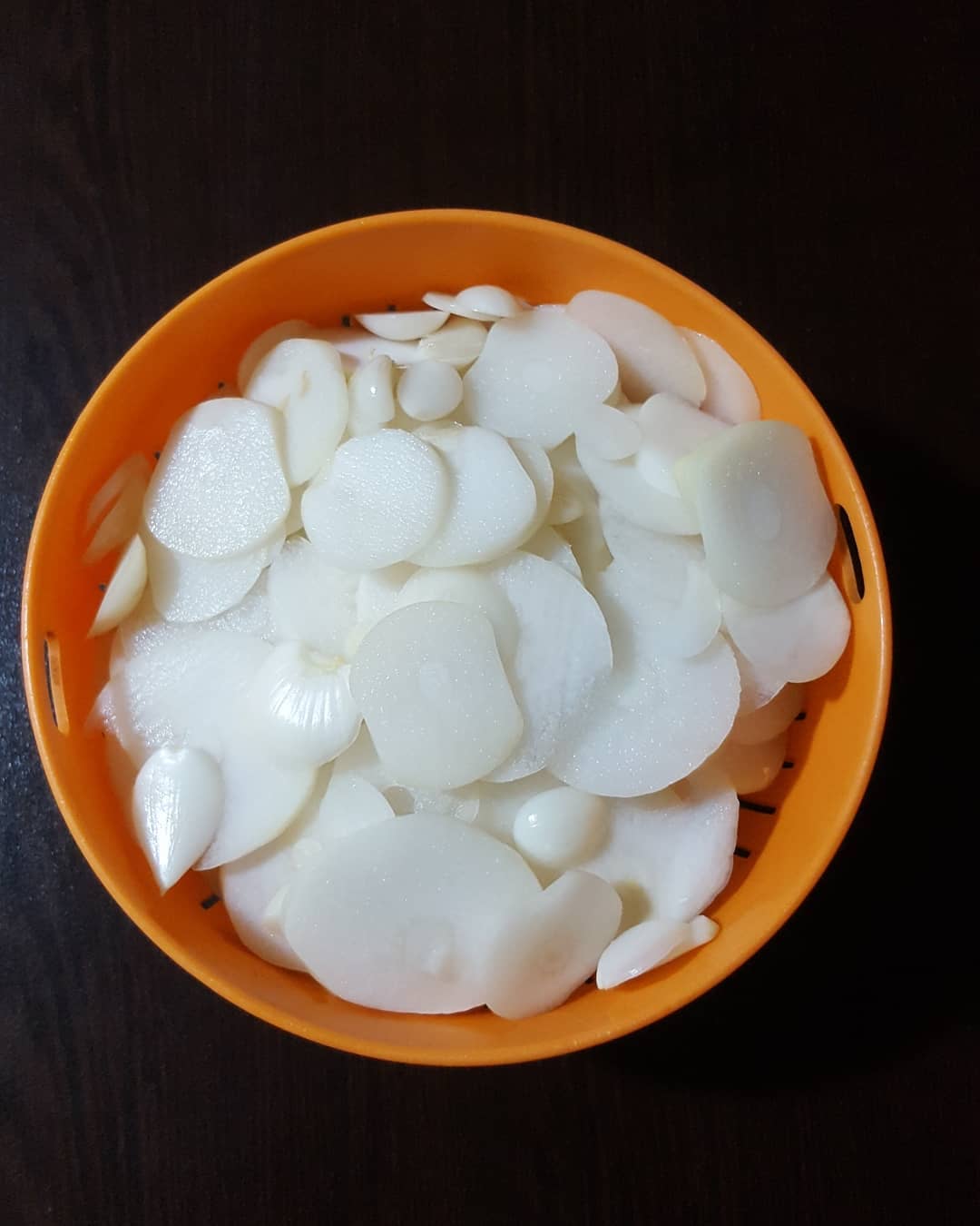 - پوستگیری: پوست قهوهای بیرونی را جدا کنید. اگر موسیر ریز است، میتوانید آن را با پوست نازکش خشک کنید (پس از خشک شدن راحتتر جدا میشود).