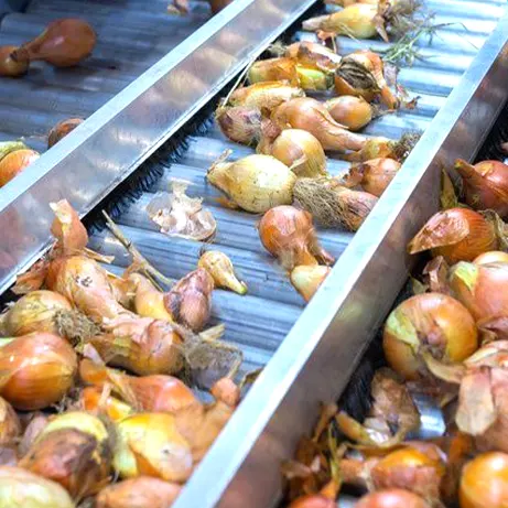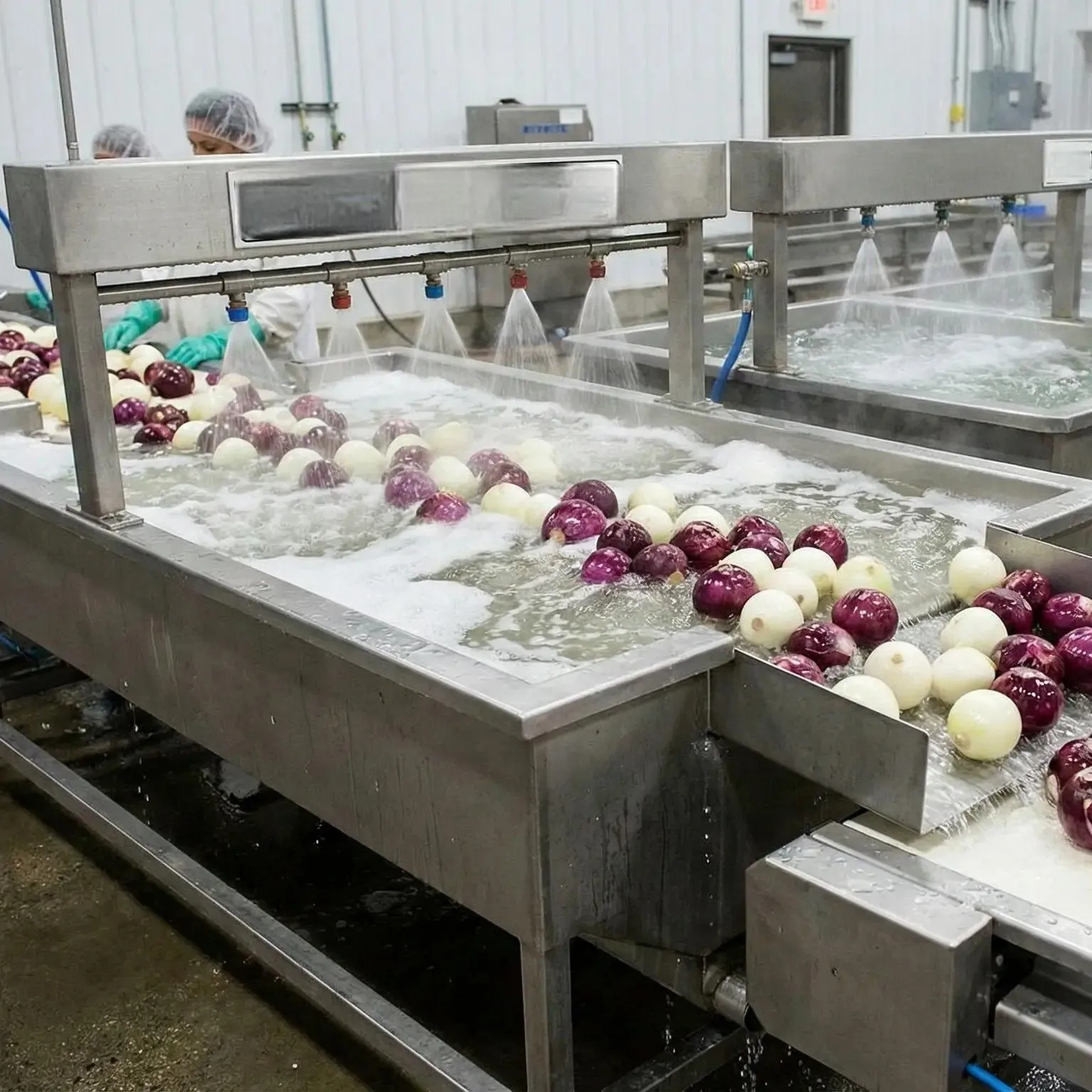 در نهایت، شستشو. این مرحله بسیار مهم است. ما فقط آنها را آبکشی نمیکنیم. پیازها از یک سیستم شستشوی چند مرحلهای عبور میکنند. ابتدا از آب کلردار برای از بین بردن باکتریهای سطحی استفاده میکنیم و سپس با گالنها آب تمیز و تازه همه چیز را آبکشی میکنیم. زمانی که پیاز از این بخش خارج میشود، کاملاً تمیز است.